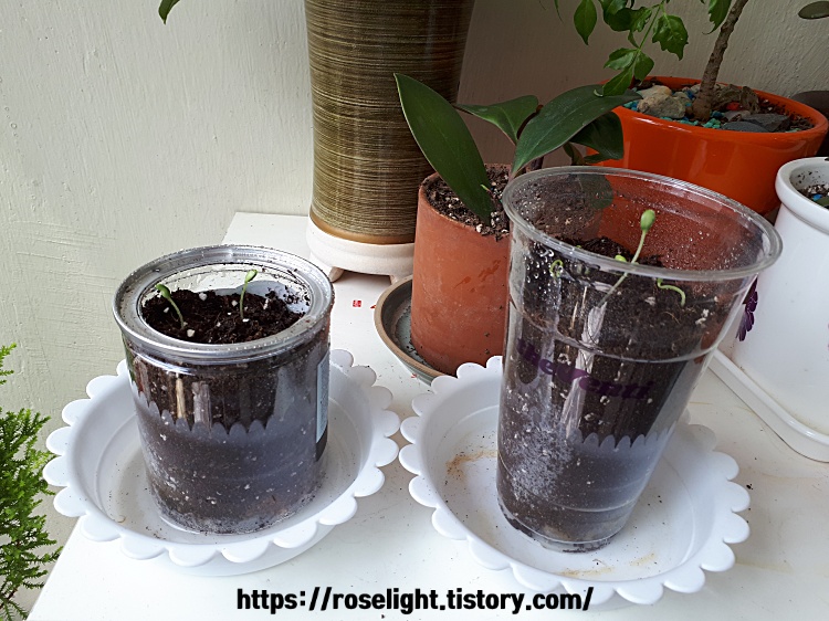 테이크아웃 컵과 플라스틱 통을 화분으로 사용했어요.