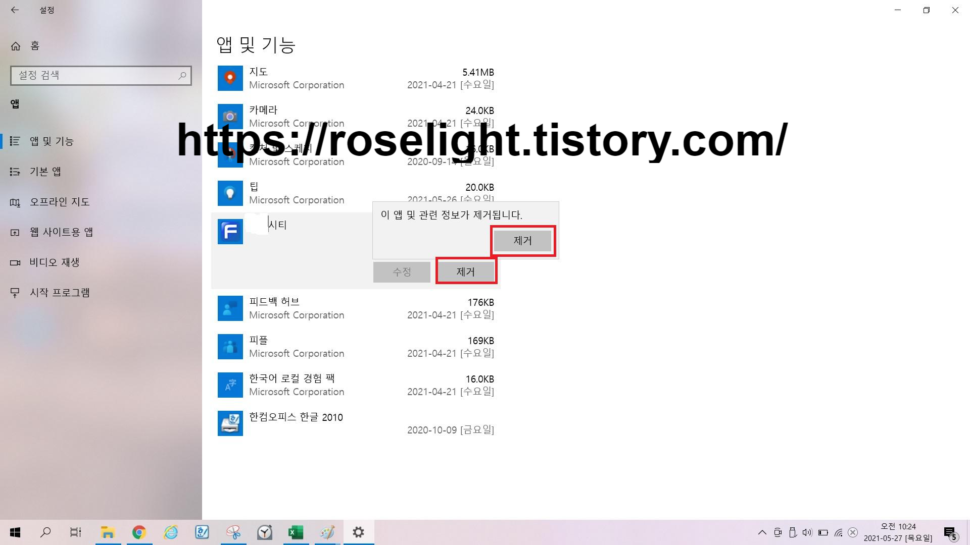 6. "이 앱 및 관련 정보가 제거됩니다." 창이 나옵니다. 제거 눌러주세요.