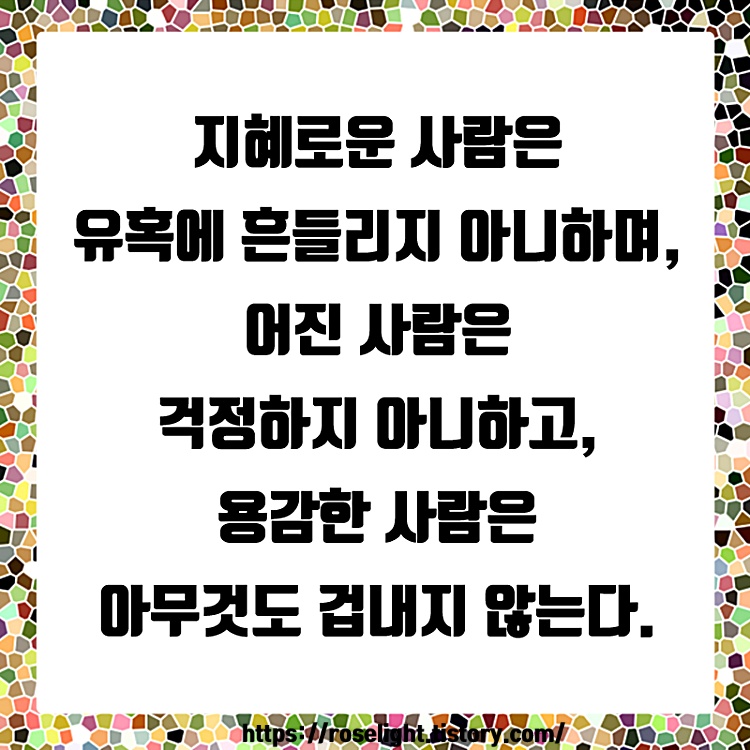 지혜로운 사람은 유혹에 흔들리지 아니하며 어진 사람은 걱정하지 아니하고, 용감한 사람은 아무것도 겁내지 않는다.