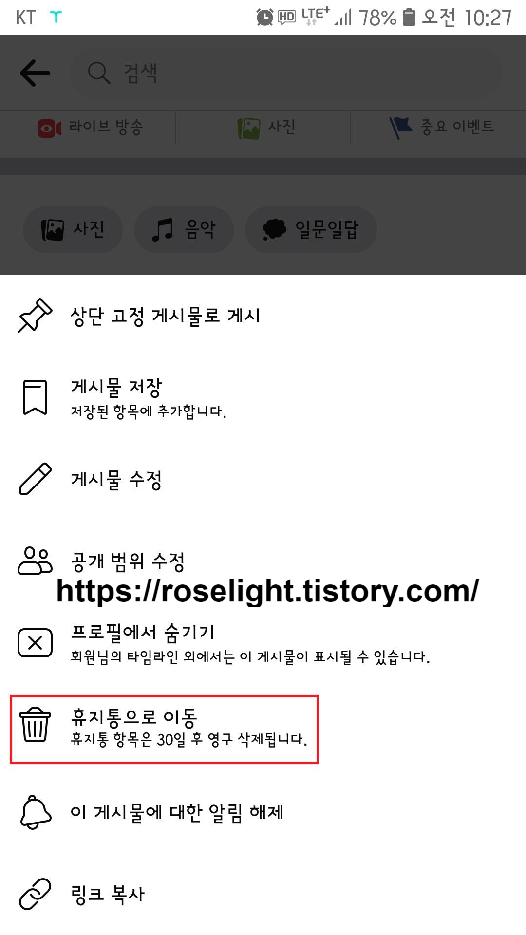 휴지통에서 삭제 할 페이스북 게시물을 선택합니다. 삭제할 게시물 그림을 꾹 눌러주세요.