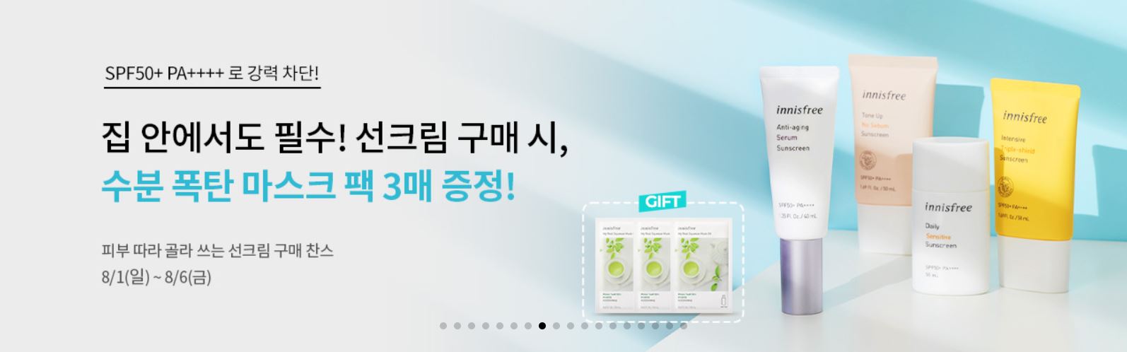 선크림 구매 시 수분 폭탄 마스크 팩 3매 증정해줍니다.