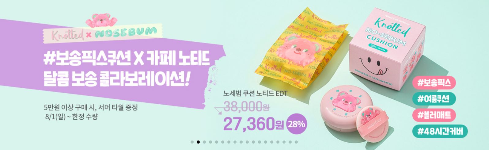 이니스프리 선쿠션 노세범 쿠션 노티드 EDT 28% 세일합니다. 여름쿠션, 48시간 커버되어 좋습니다.