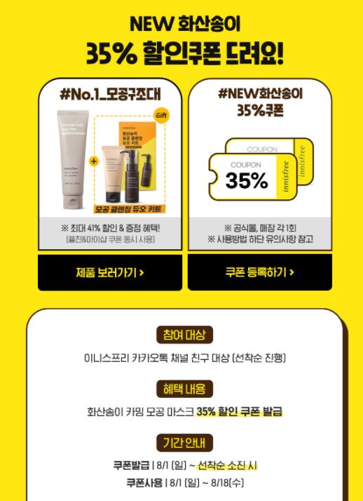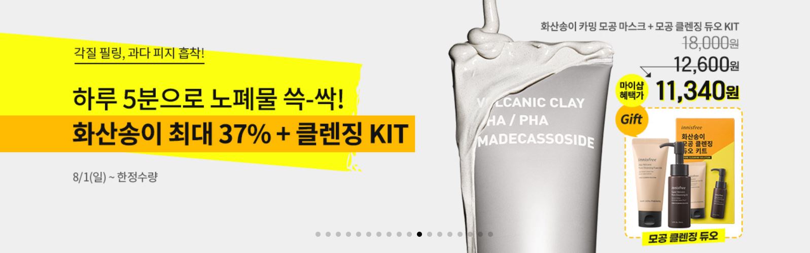 이니스프리화산송이 카밍 모공 마스크 최대 37% 세일합니다. 모공 클렌징 듀오 KIT 증정해줍니다.
