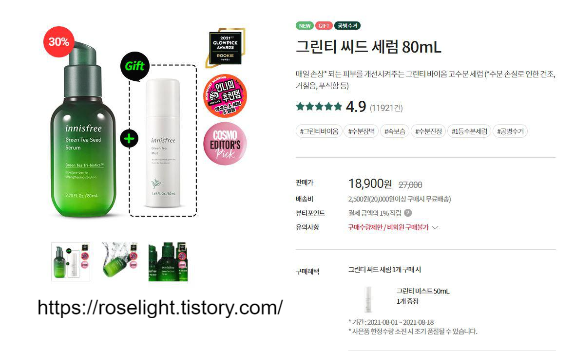 그린티 씨드 세럼 1개 구매 시 그린티미스트50ML 1개 증정해줍니다.