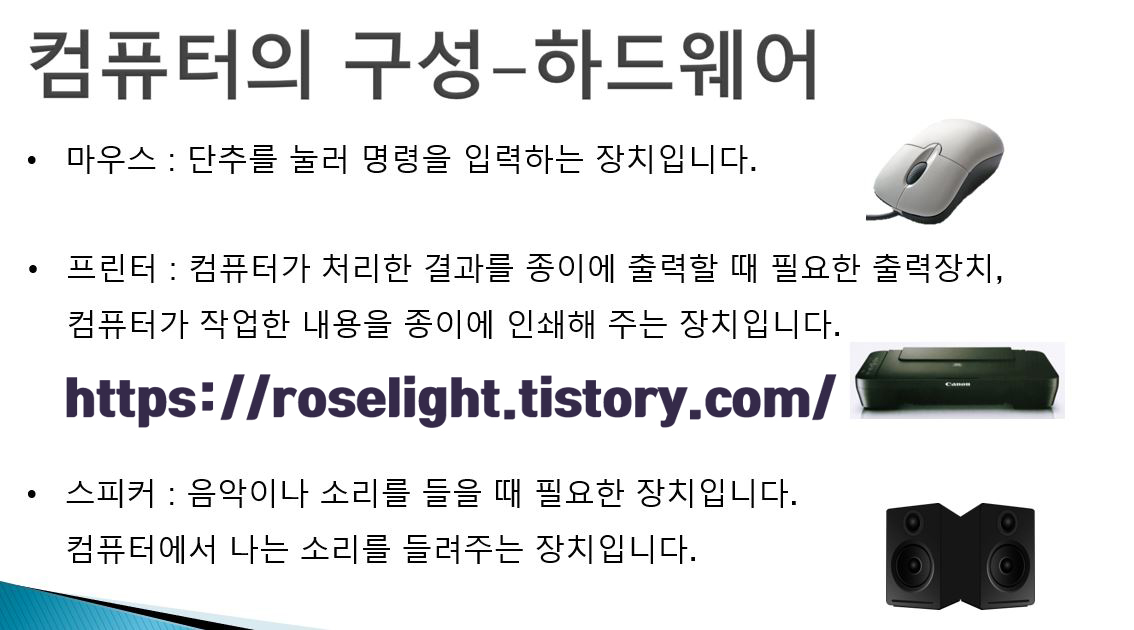 스피커: 음악이나 소리를 들을 때 필요한 장치입니다. 컴퓨터에서 나는 소리를 들려주는 장치입니다.