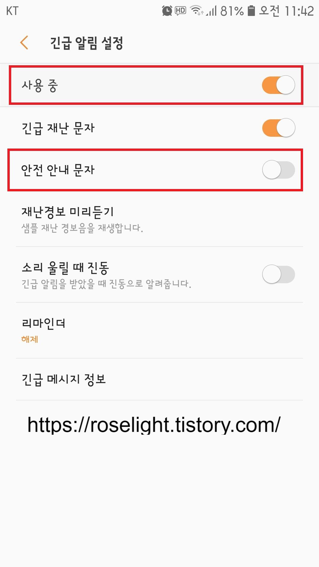 5. 긴급재난 문자는 받고, 안전안내 문자는 받기 싫으시면, 안전안내 문자만 꺼주시면 됩니다.