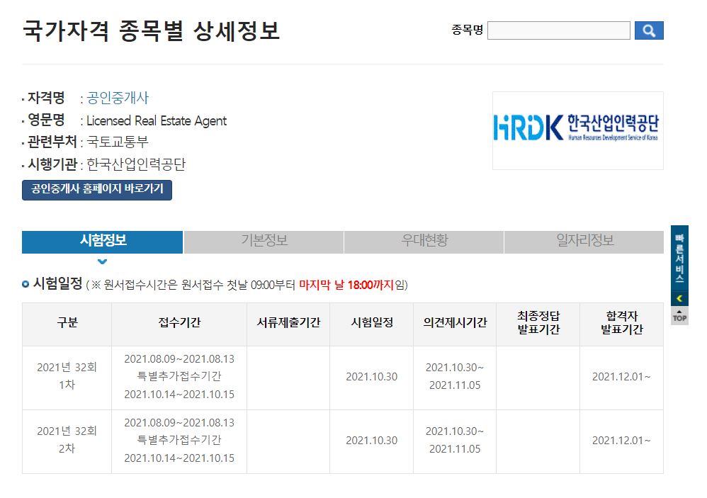 공인중개사 시험정보는 큐넷(한국산업인력공단) 사이트에 들어가시면 볼 수 있습니다.