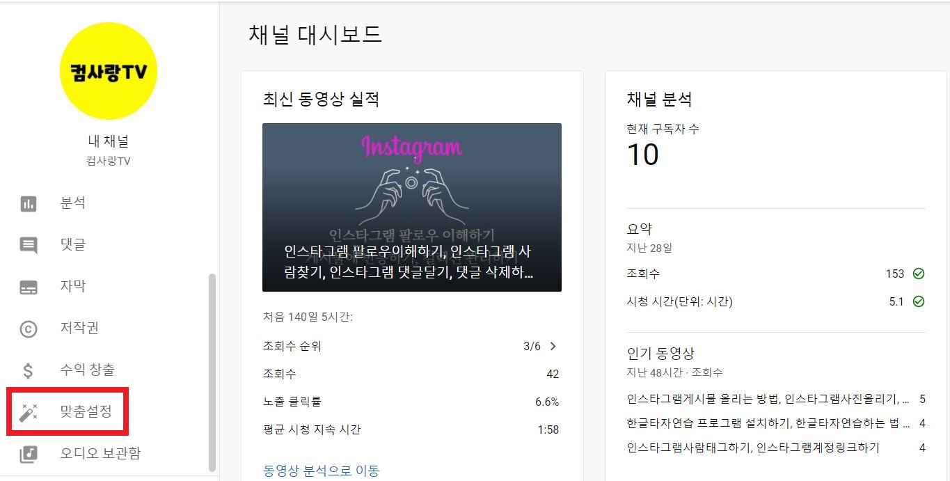 유튜브스튜디오 → 맞춤설정 →기본정보 클릭합니다.